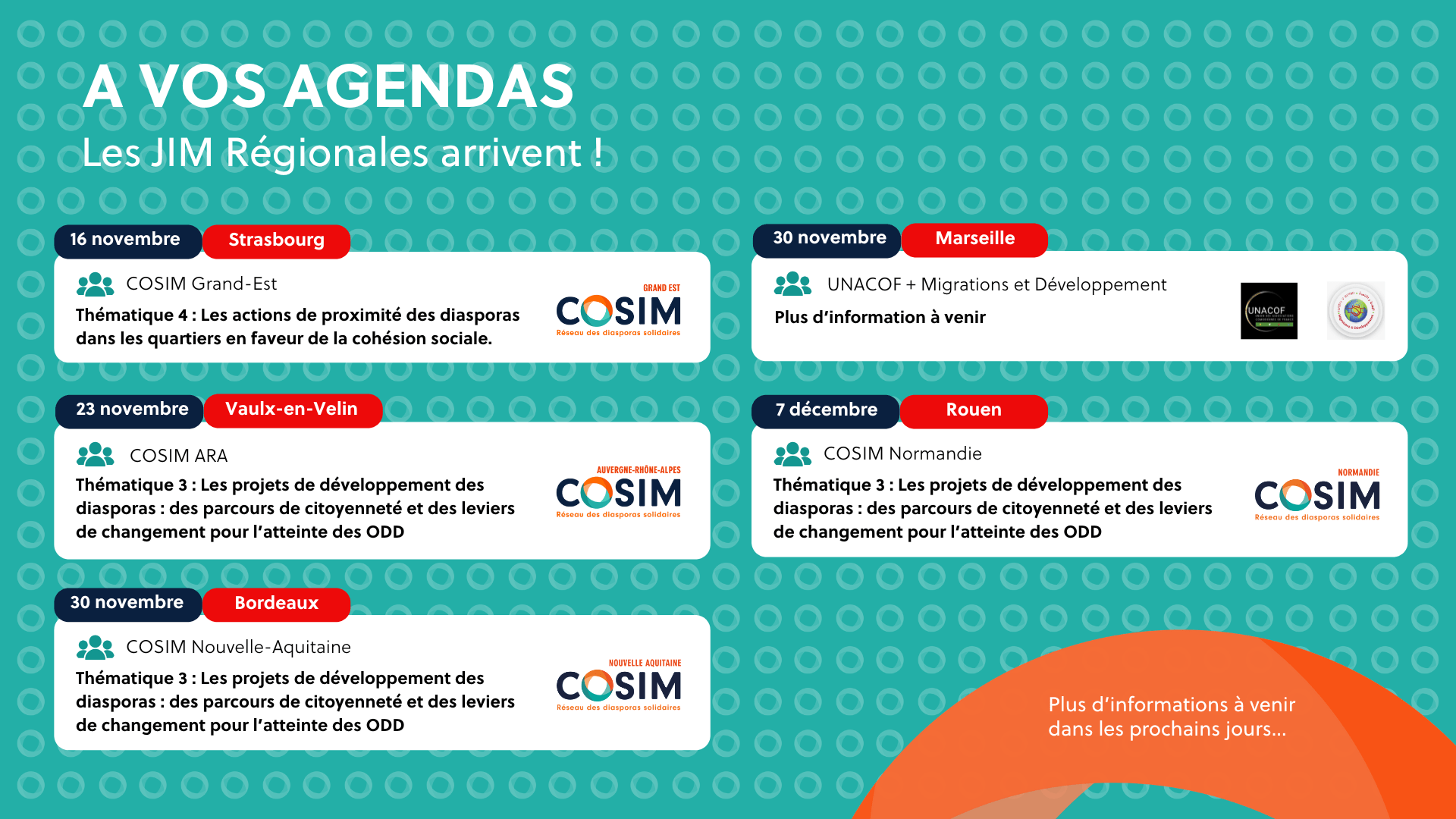 Dans ce cadre et depuis 2010, le FORIM, réseau des diasporas solidaires, organise chaque année un cycle de rencontres régionales suivi d’un événement national.